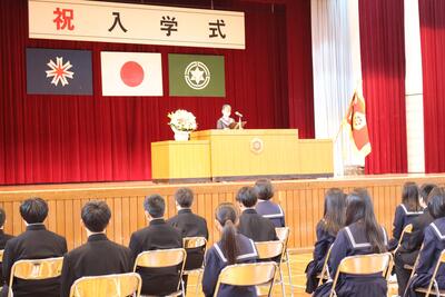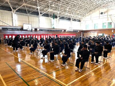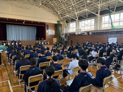 4月10日、「新入生を迎える会」を実施しました。生徒会長の軽妙なトークから始まり、生徒会活動や学校行事、部活動の紹介など、子どもたち主体で行いました。新生徒会本部結成後、初の行事の企画・運営でしたが、わずかな準備期間だったにもかかわらずスムーズに進行し、ねらいどおりの温かい雰囲気の中での会となりました。