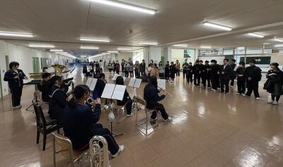 現在は、新1年生がいろいろな部活動を訪れて入部を決める部活動見学期間です。その一環で、吹奏楽部が1Fフロアにてミニコンサートを開催しました。